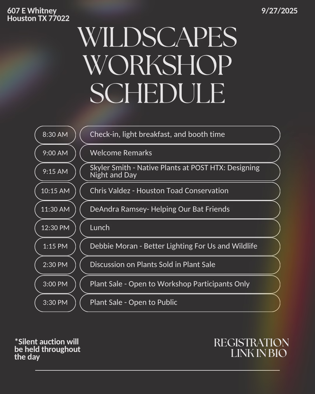 Don’t leave Wildscapes empty-handed! Our curated plant sale features a variety of native species perfect for Houston gardens. Quantities are limited, and the best selections go fast — so come early, ask questions, and bring home a piece of the wild.