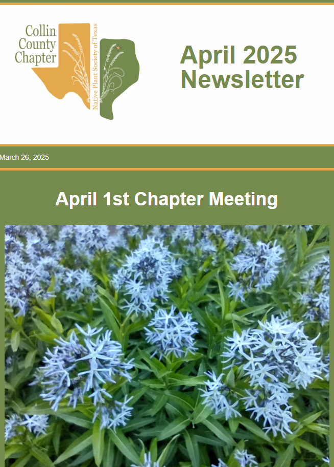 The Collin County Chapter’s monthly newsletter is provided to inform our members and guests of events, volunteer opportunities, and local native plant news. Click here for an archive of our e-newsletters, starting in March 2025.