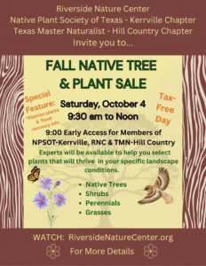 Our Chapter Meetings are generally held on the second Tuesday of each month from 1:30-3:00 pm, September – May, at Riverside Nature Center, located at 150 Francisco Lemos Street, Kerrville, Texas.
