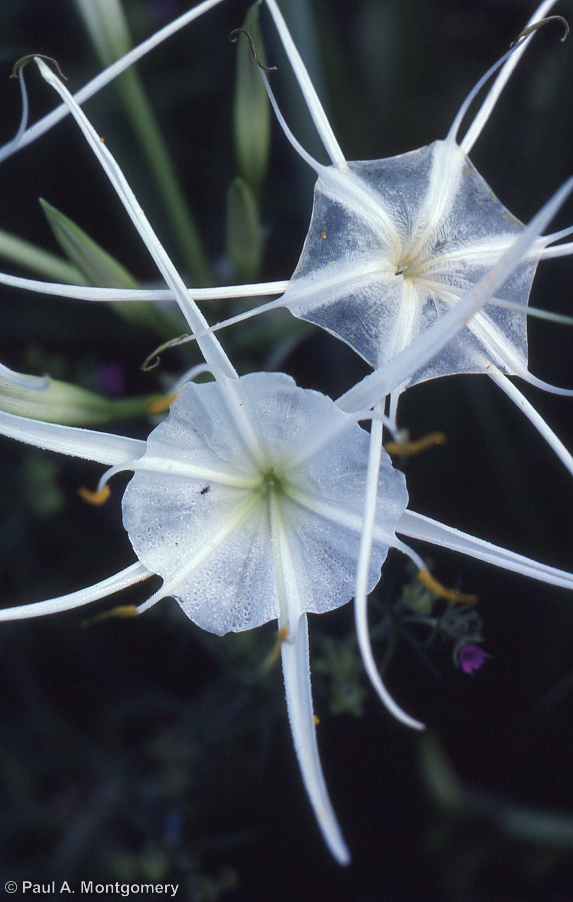 | Texas Spiderlily | Hymenocallis liriosme | Suggested by Gail McConnell and Martin Simonton, the "Texas spiderlily" is actually a member of the amaryllis family. Common names can be confusing. There is also a plant called "red spider lily" which is actually Lycoris radiata. Both have beautiful flowers. |
