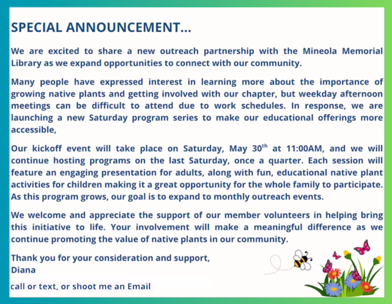 The Lakes and Pines Chapter is excited to share a new outreach partnership with the Mineola Memorial Library as we expand opportunities to connect with our community.