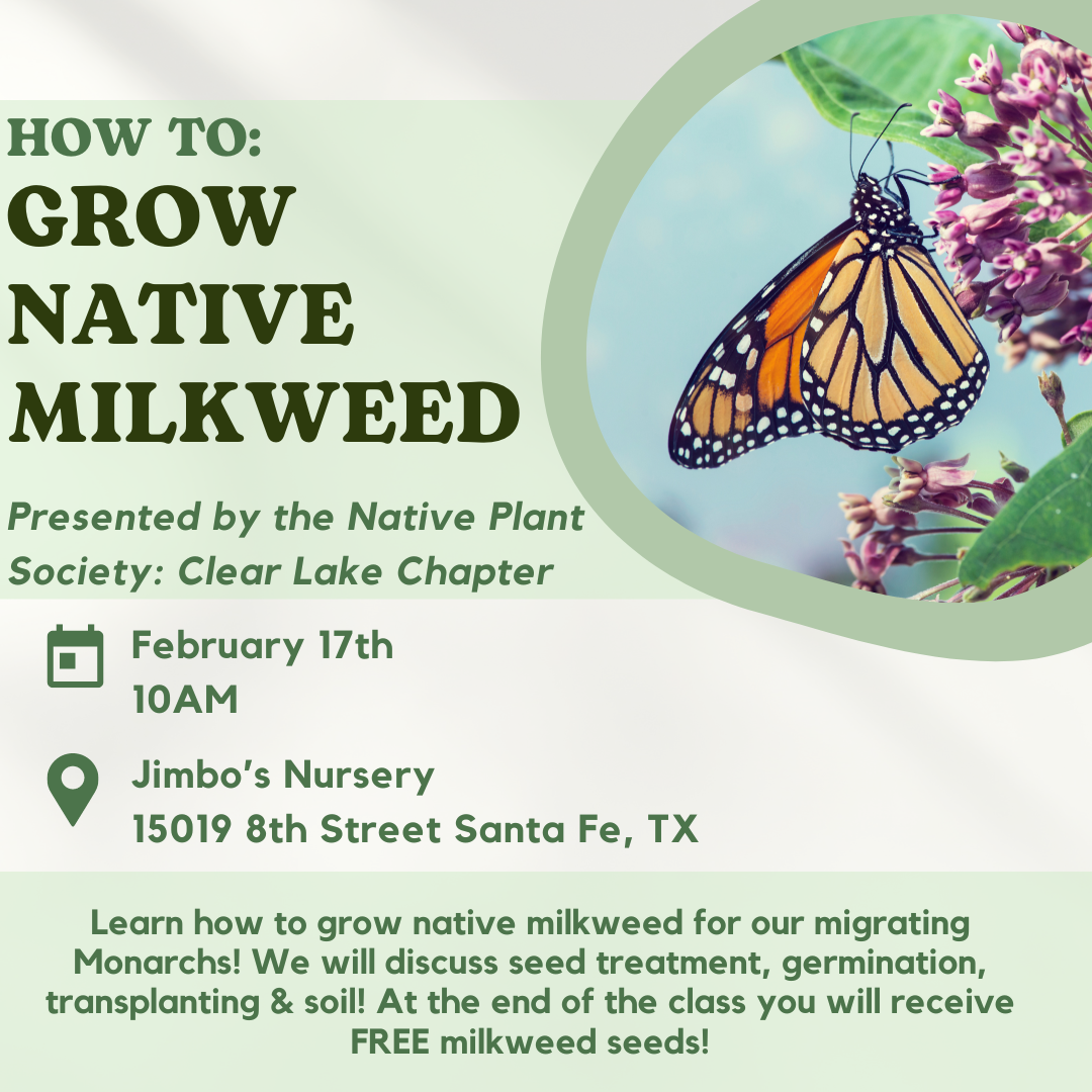 The Clear Lake Chapter is having a one day, cash only milkweed sale February 20 at UHCL.