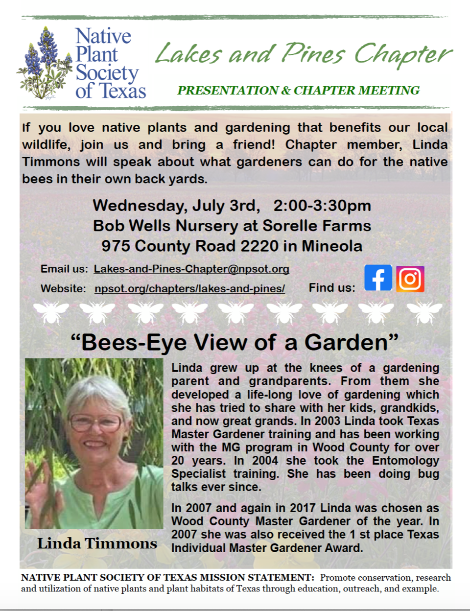 Monday, July 8 — Clear Lake Chapter Meeting — Through photos and stories, native Texan Cherie Colburn demonstrates how attention to where, why, and what’s in our gardens can make us better stewards of our world.