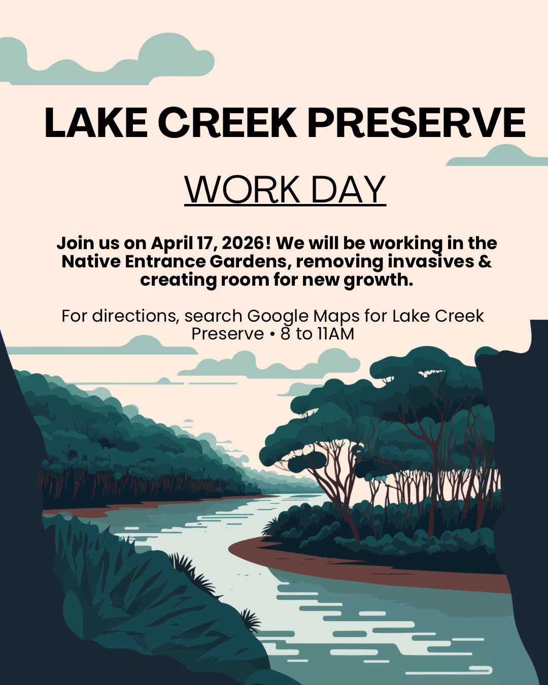 We will be working in the Native Entrance Gardens, removing invasive sand creating room for new growth. For directions search Google Maps for Lake Creek Preserve.
