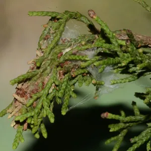 My curiosity got the better of me and I pulled one of the structures apart. It was a protective shelter for a green larva about three-fourths of an inch long. I had an idea what it might be, since I mentioned it in a Boerne Star article on Ashe junipers in 2012. I decided to clip off the structure and put it and the larva in a container. With no additional food, the larva in its secure structure continued right on through its appointed life cycle. After the larva pupated in a couple of weeks it turned into a moth a week later. It was a Juniper Budworm Moth.