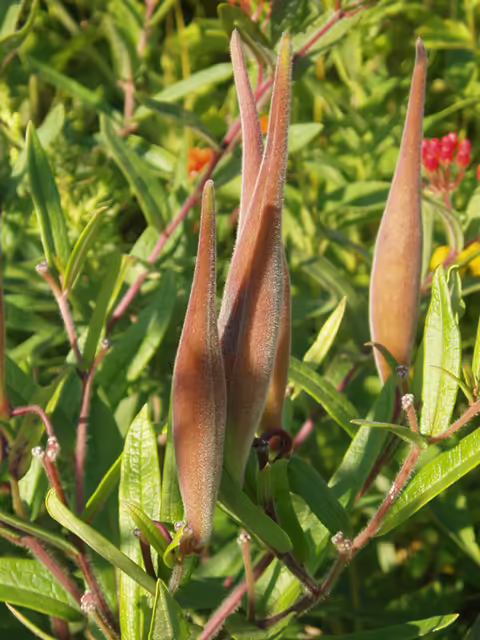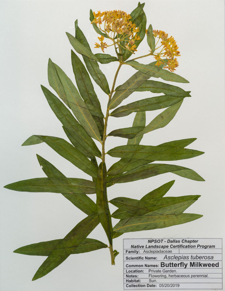 Blooms May-September. Upright form, grows in clumps. Stiff, lance-shaped foliage. Bottom of leaf is a lighter green then the top. Long taproot. Large, flat-topped clusters of bright-orange flowers. Fruit is a grayish green pod covered in short hairs. This species has no milky sap like other milkweeds. Although still listed by some in the Asclepiadaceae Family, the majority of botanical organizations now list it in the Apocynaceae Family. Larval host: Monarch, Queen, and Grey Hairstreak butterflies.