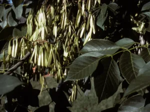 Blooms April-May. A large tree with a straight trunk and dense, conical or rounded crown. Mature trees develop gray bark with distinctive diamond-shaped ridging. Compound leaves are divided into 5-9 leaflets that are rounded, with whitish lower surfaces. Purplish male and female flowers occur on separate trees, growing in tight panicles before leaves emerge. Winged seeds are called samara. Larval host: Eastern Tiger Swallowtail, Hickory Hairstreak, Mourning Cloak, Red-spotted Purple, Viceroy and Tiger Swallowtail.