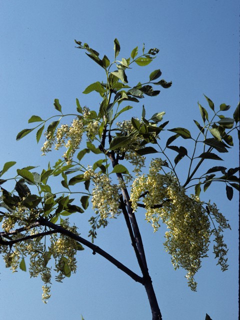 Blooms May-June. A small tree, with short trunk, and rounded crown of spreading branches. The light brown bark of young plants becomes more furrowed and darker with age. Produces gray-green to bright-green compound leaves. Male and female flowers occur on separate trees. Female flowers appear in loose clusters; male flowers appear as dark clusters around the twigs, often before the leaves. The fruit is a cluster of slender, tan, winged seeds. Larval host: Two-tailed Tiger Swallowtail, Tiger Swallow-tail, Orange Sulphur, Sleepy Orange, Cloudless Giant Sulphur.