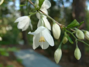 Blooms March-June. A small rounded tree with 3-7″ leaves that turn yellow in fall. Produces white, bell-shaped flowers, with four petals, and a tight cluster of stamens in the middle resembling a candle in a holder. Ornamental fruits have two winged seed that turns tan in fall.