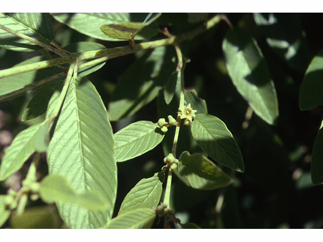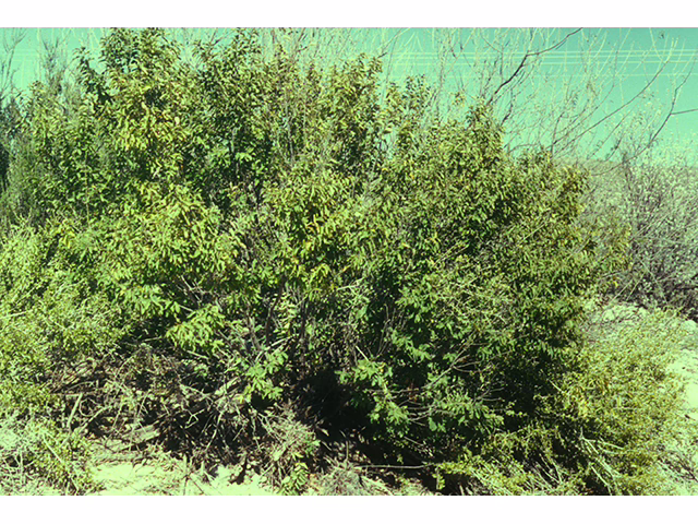 Blooms March-October. Can grow as small tree or tall shrub with soft, lime-green, strongly veined leaves and a nice rounded shrub form. Produces small, greenish yellow flowers. Fruit turns black when ripe. Larval host: Two-barred Flasher butterfly.