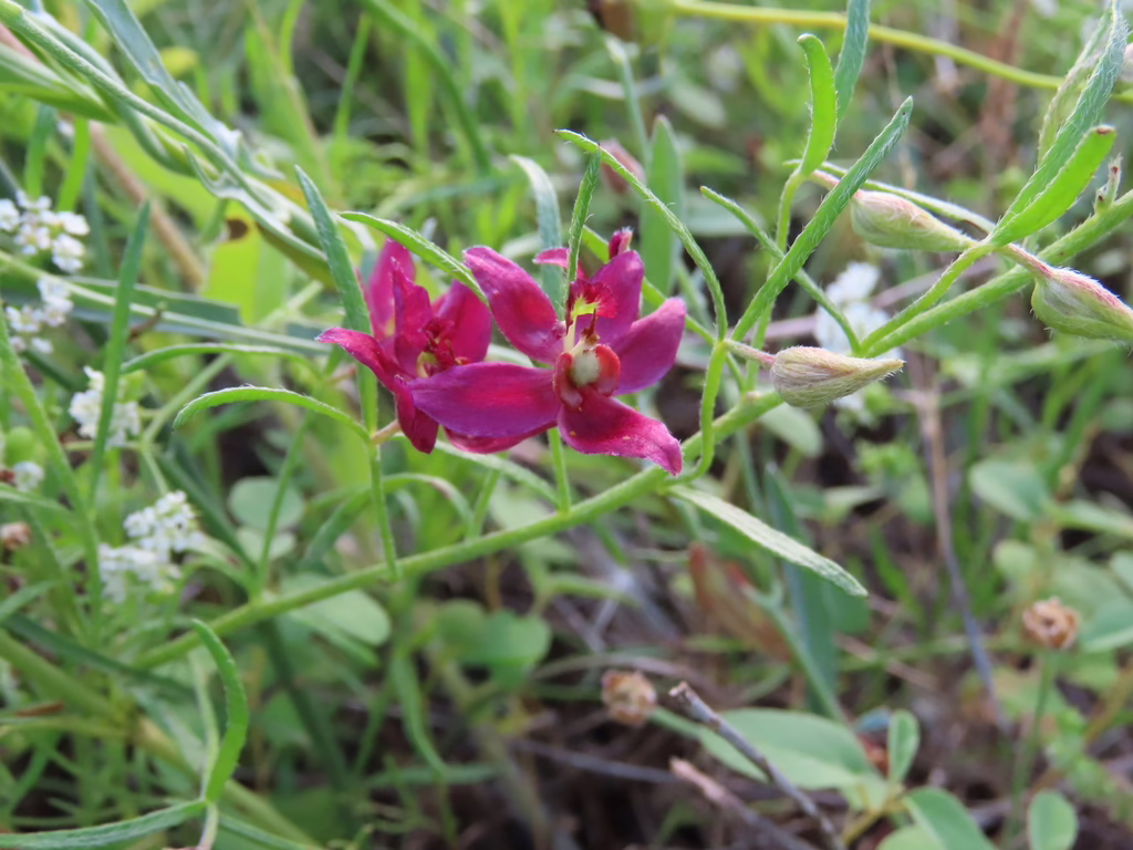 Seed Scarification Use a small, triangular, fine-toothed file to create a groove that penetrates the capsule just to the point that the seed inside becomes visible. The seed is tan and fills the capsule, so don’t blithely file away through the capsule into the seed. Holding the capsule firmly with small needle-nose pliers saves getting numerous stabs from the spines. Be careful of crushing the capsule and the seed within. Empty capsules became apparent when the file groove opened into an empty space. Floating in water seems to be a way to separate empty from viable capsules, with viable seeds sinking quickly, but more information is needed. Plant the seeds in a well-draining soil mix. The seeds are reported to require light for germination, so don’t bury them too deep. germination can be slow and erratic, sometimes taking several months. In my case, using six fresh seeds collected 2 days prior (some taken from the plant, others from the ground where they had fallen), the six seeds all germinated within 2 weeks. Three germinated outside in potting soil medium and three germinated indoors in damp vermiculite (before I could get them into cold stratification). K. lanceolata is reported to be an obligate semi-parasite, forming haustoria on the roots of a broad range of host plants. In pots it may be necessary to include one or more other native plants. The wild plants providing my seeds are growing among primarily Nolina lindheimeriana and Aristida purpurea. Collect seed in summer when fruit is brown and sharp. 1) https://www.wildflower.org/plants/result.php?id_plant=KRLA 2) https://propagate.one/how-to-propagate-krameria-lanceolata/?print=print 3) https://beetlesinthebush.com/2009/08/07/friday-flower-krameria-lanceolata/ 4) Tom Heger, NPSOT member, personal growing experience.