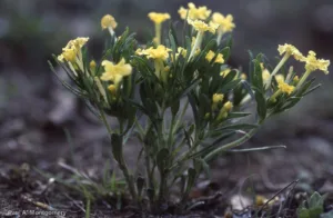 Blooms April-June. Forms one to several leafy stems, branched above on older plants. Very narrow, hairy leaves with rolled edges, are larger near the base. Tubular, lemon yellow flowers, with 5 fringed lobes, grow in clusters at the end of stems. The plant produces few fruits from the showy flowers, and instead, late in the season inconspicuous flowers, that remain closed, produce fruit in the lower leaf axils. The genus name Lithospermum means “stone seed,” referring to the hard nutlets. Pollinated by butterflies, skippers. Grasshoppers, Long-horned beetles, Gray Ethmia (Ethmia monticola fuscipedella) feed on foliage.