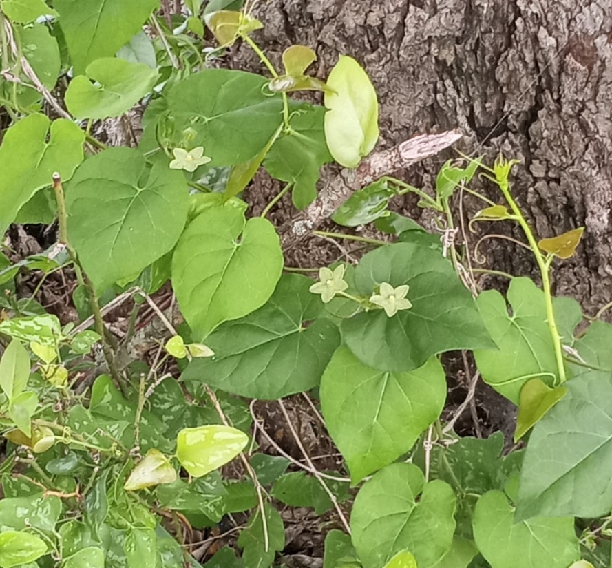 Blooms April-July. A twining vine with prominent heart shaped leaves. Attractive, green star-shaped flowers have a pearly iridescent center. A typical milkweed pod opens up to release many seeds attached to silky threads. Although still listed by some in the Asclepiadaceae Family, the majority of botanical organizations now list it in the Apocynaceae Family. Larval host: Queen and Monarch Butterflies.