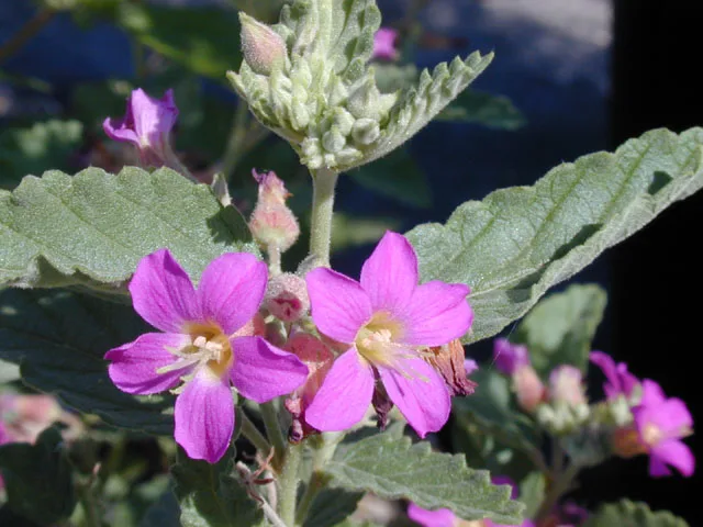 Blooms March-November. Rare in the wild, but propagated commercially. Lance-shaped leaves have wavy edges, covered with gray-white dense hairs. Small clusters of pinkish-purple flowers bloom on and off year round. The fruit is a capsule.