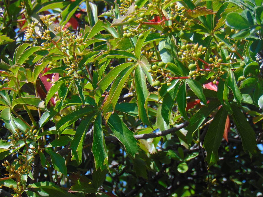 Blooms April-June. Resembles Virginia Creeper but, has 7 leaflets instead of 5, and is much less common. Large, palmately compound leaves, have serrated edges. Small inconspicuous, greenish flowers, arranged in a corymb, or flat headed cluster. Fruit is a cluster of small blue-black berries.