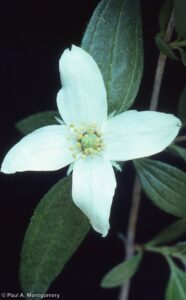 Blooms April-June: Small shrub with loose bark on the main stems. Leaves narrowly ovate, with smooth margins and 3 prominent veins on the upper surface, the lower surface covered with hairs. Numerous showy, white flowers along branches. The fruit is a capsule shaped like a top.