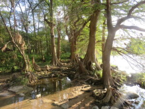 The Edwards Plateau area is also called the Hill Country; however, this general term covers a much larger area extending farther north. Spring-fed creeks are found throughout the region; deep limestone canyons, rivers, and lakes (reservoirs) are common. Ashe juniper is perhaps the most common woody species found throughout the region. Additional woody species include various species of oak, with live oak (Quercus fusiformis) being the most common. Sycamores (Platanus occidentalis) and bald cypress (Taxodium distichum) border waterways. This area is well known for its spring wildflower displays, though they may be viewed in spring, late summer, and fall, as well. According to Texas Parks and Wildlife, average annual rainfall in the Edwards Plateau ranges from 15 to 34 inches.