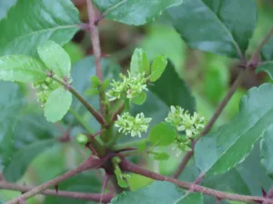 Blooms January-May. Aromatic and showy, round headed tree or shrub with spines on branches. The gray bark is covered with spine-tipped cone-like growths. Lustrous, compound leaves, are divided into 5-19 leaflets with serrated edges. Clusters of whitish-yellowish flowers form in spring, male and female flowers on separate trees. The fruit is a two-valved capsule that contains several small black seeds, produced only on female trees. Larval host: Giant Swallowtail Butterfly.