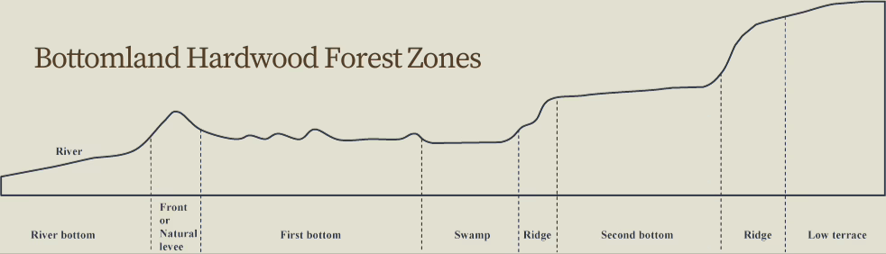 A fascinating element of the Bottomland Hardwood Forests is the topography that developed over millennia. Changes in a river’s water level are responsible for the creation of these distinct zones. In some cases, the zones can be only a few feet apart, but the soil and water conditions can be vastly different, resulting in drastic vegetation change.