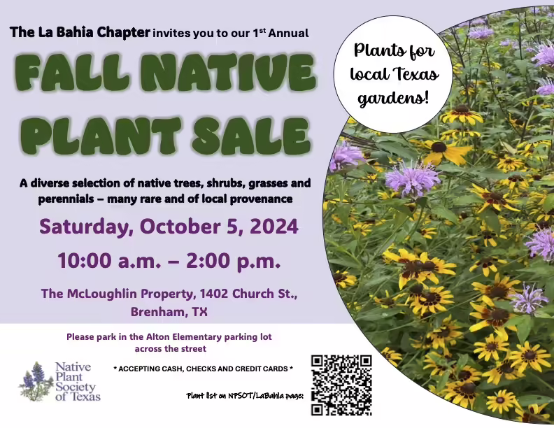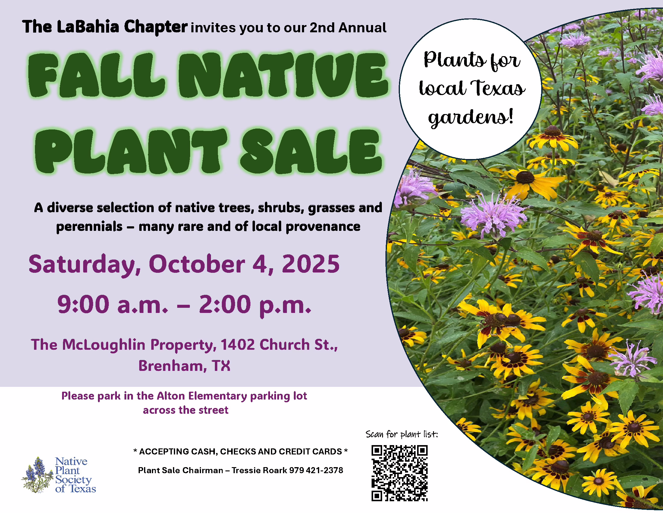October 4, 2025 9:00am – 2:00pm Location:  The McLoughlin Property, 1402 Church St., Brenham The LaBahia Chapter is having a PLANT SALE on October 4, 2025 in Brenham, Texas! Fall
