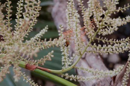 The palmetto also has a spectacular bloom in the early summer. It sends up one or more 2-4 foot spikes, from which numerous small white blossoms emerge along stems up to eight inches in length. Insects of all varieties find it irresistible.
