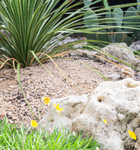 Mulching reduces water evaporation, suppresses weeds, and keeps plant roots cool in the summer and warm in the winter. Mulch can also help prevent soil crusting, which can otherwise lead to decreased water permeation and increased runoff. When you’re choosing the type of mulch to use, consider the plants that are being mulched. Some native plants do much better in poorer soils, and a thick layer of decomposing organic mulch might provide more organic matter than they need, resulting in fungal issues. In cases like this, a mineral mulch such as decomposed granite might be a better choice (be aware, weeds actually thrive in that yummy material, however). If using organic material amongst native plants, consider using a sparser thickness of only two inches (the general recommended amount is 2-4 inches), and pull the mulch 2-3 inches away from the plant’s stem. If you’re hydrozoning as described above, mulch more heavily only in the zones where the plants have greater water requirements.