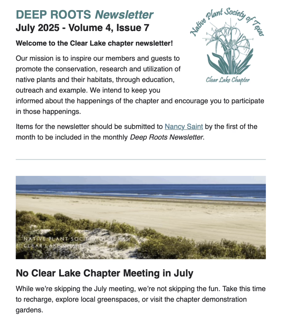 Clear Lake narrowly edged out San Antonio to win the newsletter contest. Editor Nancy Saint submitted the July 2025 edition for the contest. You can download and read the entry here.