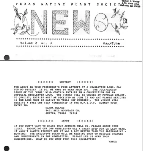 Since its founding the Society has provided a news periodical to its members. there have been a variety of names and formats. The Texas Wildfower Newsletter edited by Carroll Abbott served as the first newsletter. He advocated the formation of the Native Plant Society of Texas in his quarterly publication Texas Wildflower Newsletter. After the Society was created in 1980, a free subscription to Abbott’s newsletter was provided as a benefit to all members. His declining health eventually prompted Abbott to request that the Society start its own newsletter. Lean more about the Carroll Abbott story.